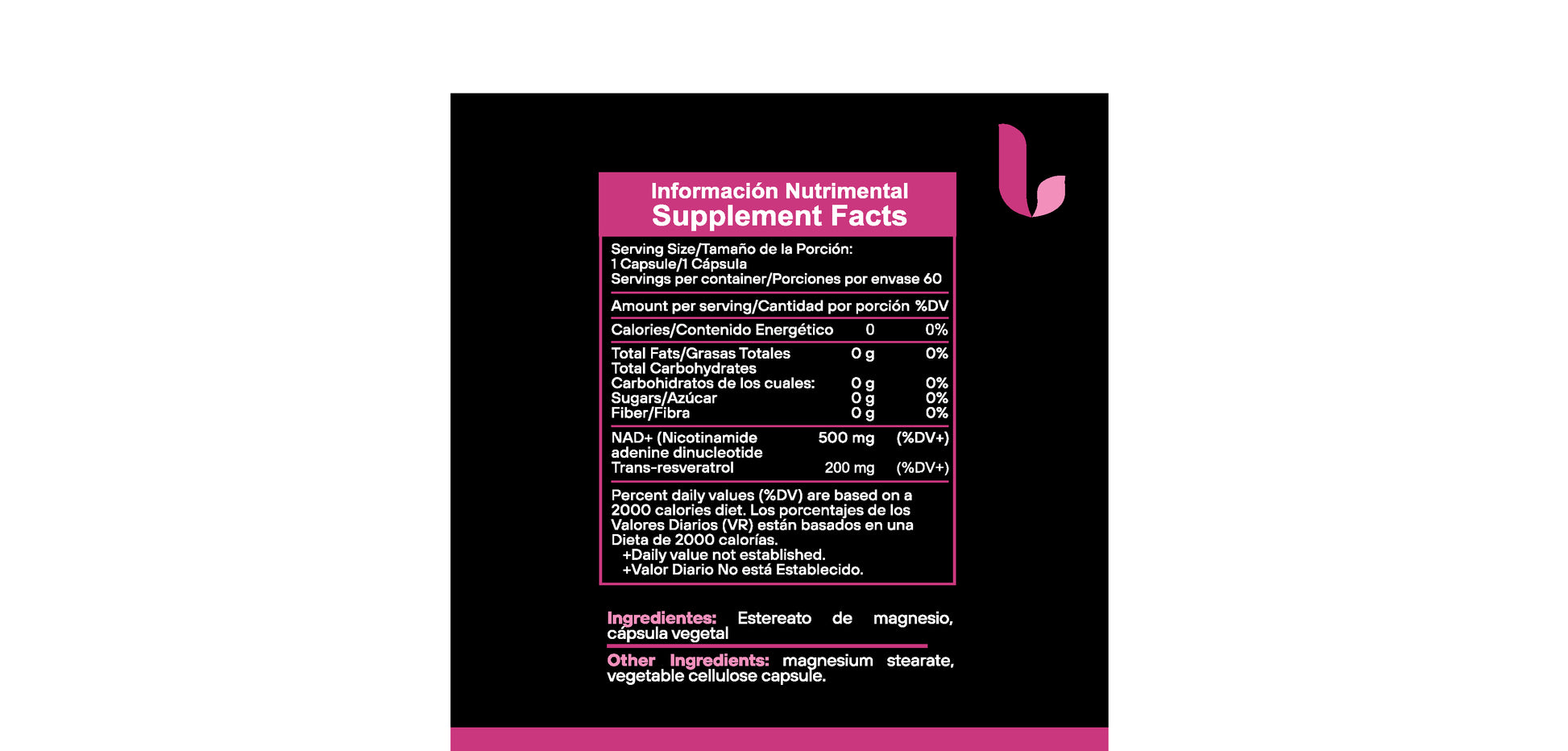 Nicotinamide Riboside increases cellular levels of NAD+, an enzyme that’s essential for creating youthful amounts of cellular energy. This longevity nutrient helps fight general fatigue and encouraged youthful cognitive function in preclinical studies, making it the perfect pairing with Resveratrol.